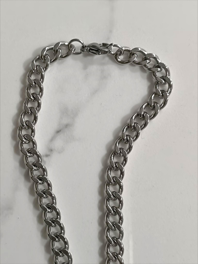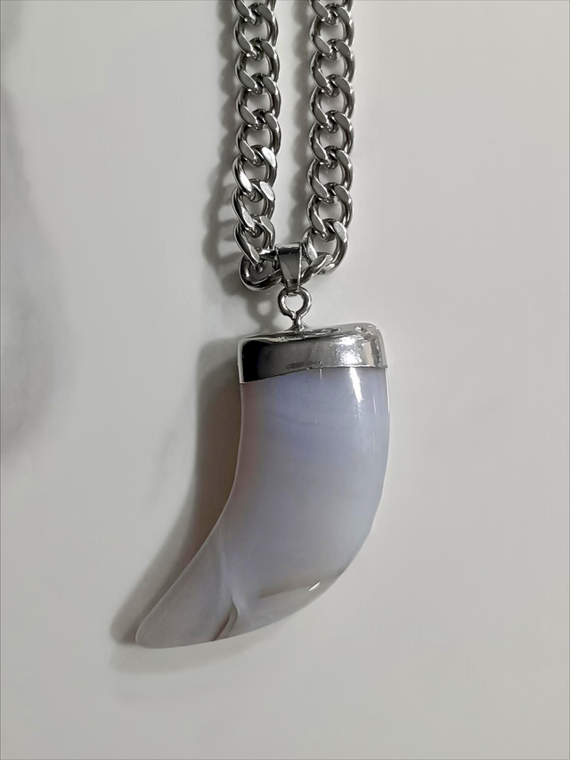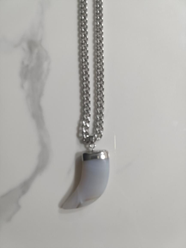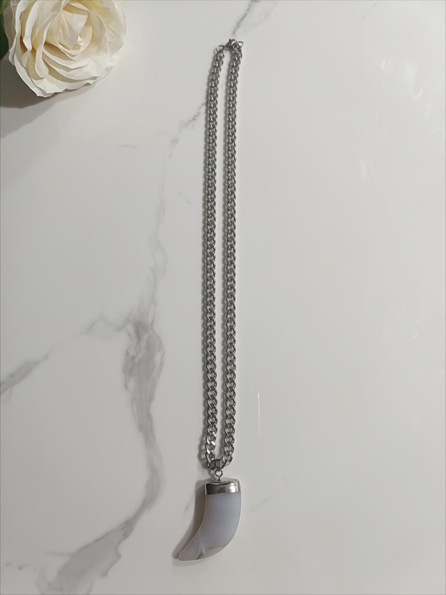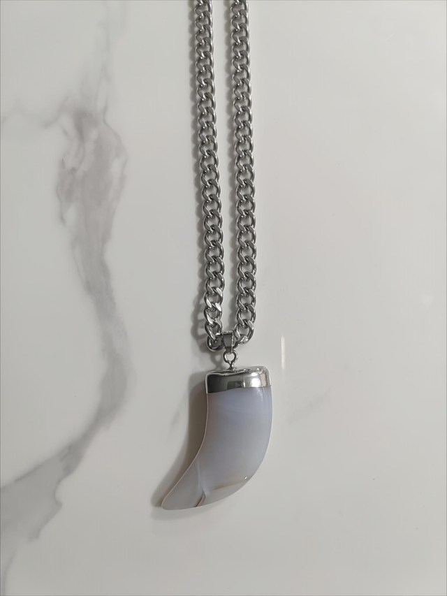 Collar Cuerno Lunar. Este collar combina la robustez de una cadena de eslabones de acero plateado con la delicadeza de un colgante de cuerno con acabado de luna. Su diseño moderno y audaz lo convierte en una pieza versátil, ideal para quienes buscan un accesorio con carácter y un toque de misterio. Es perfecto para añadir un toque de rebeldía y sofisticación a tu estilo.