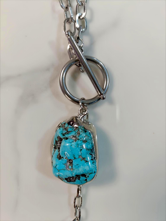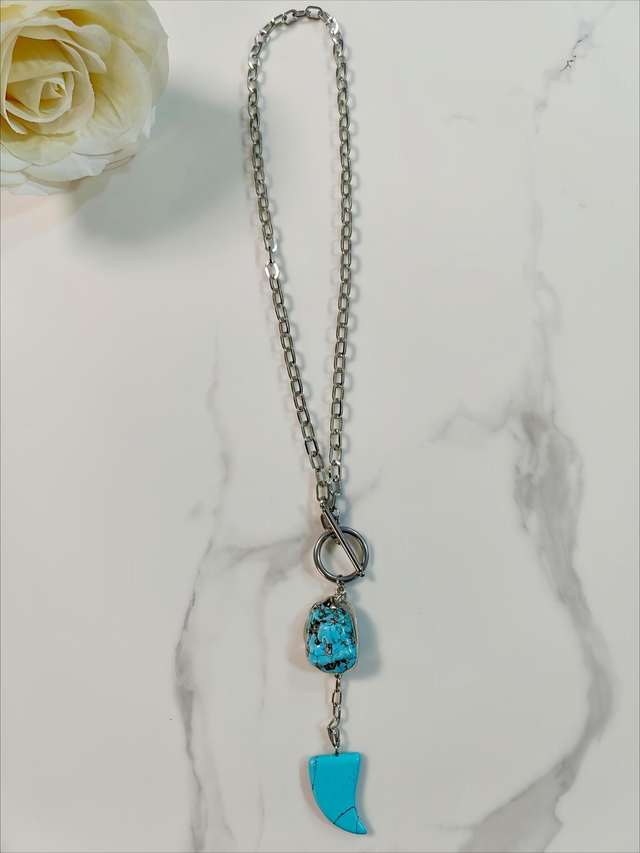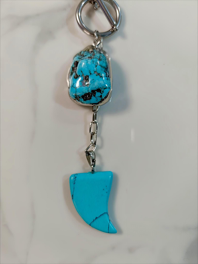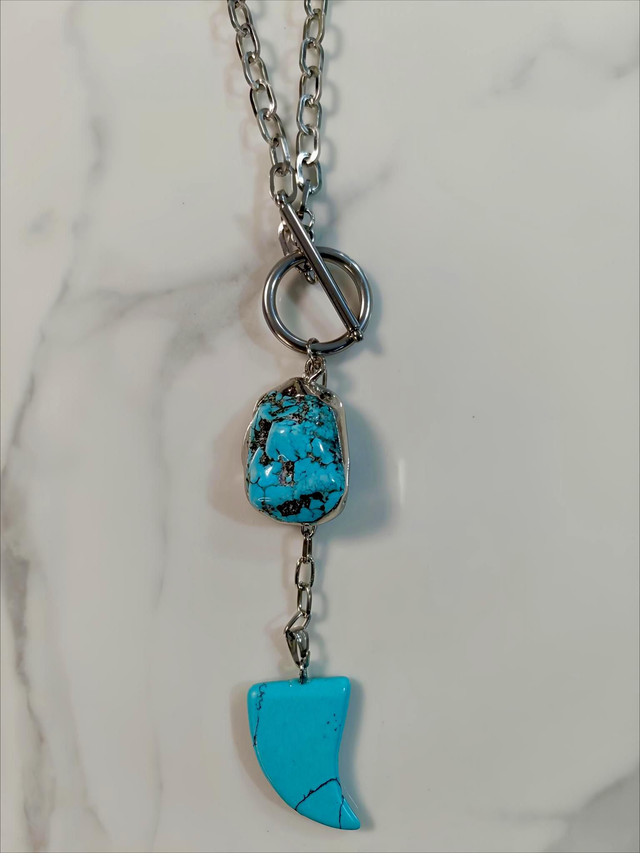 El collar Garra de la Naturaleza combina la fuerza del acero con la calma protectora de la turquesa. Una pieza que une lo salvaje y lo espiritual, diseñada para mujeres que caminan seguras, dejando huella a cada paso.