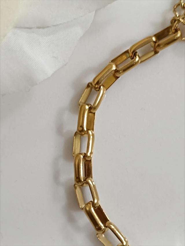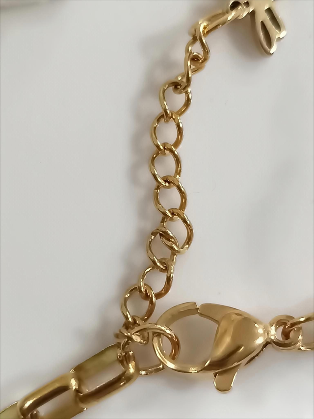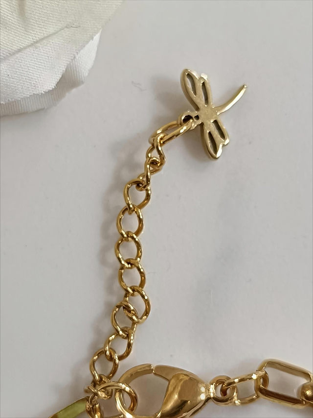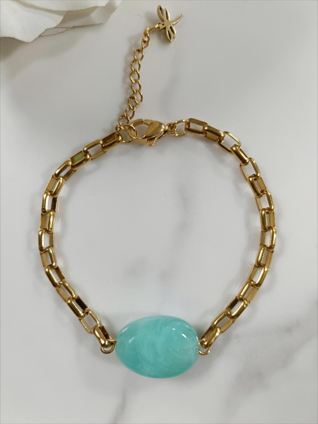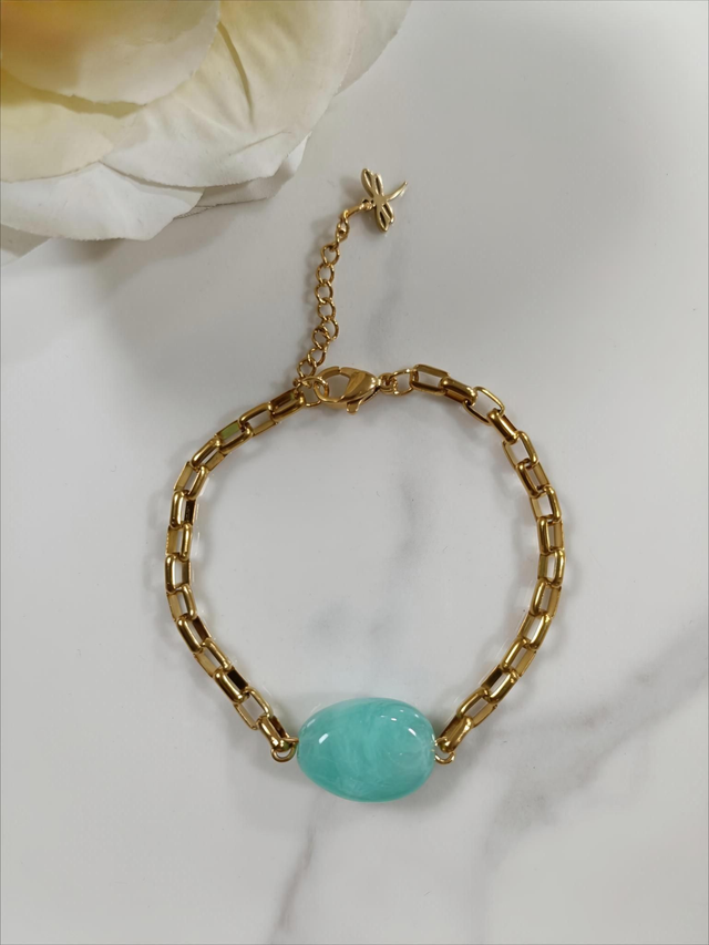 Pulsera de acero dorado con pieza central verde agua, símbolo de frescura y calma. Su diseño combina elegancia y naturalidad, perfecta para acompañarte en esos momentos en los que decides simplemente disfrutar.